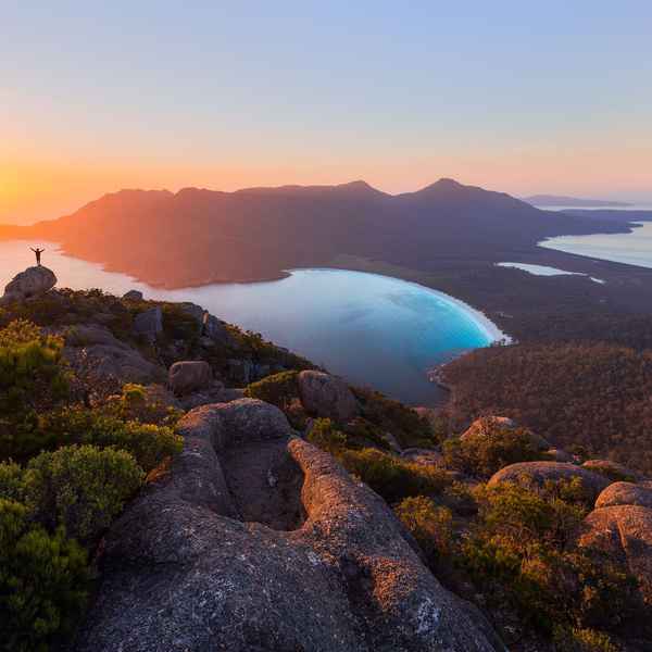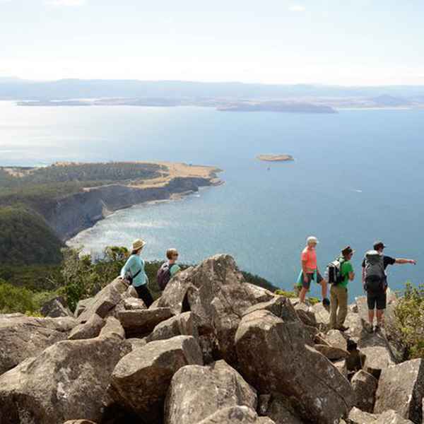 Our final day begins with breakfast on board Lady Eugenie. We can observe the busy shorebirds and towering forms of The Hazards mountain range above. We ascend gently between pink granite boulders and, taking our lunch trackside, we overlook the white sands and turquoise waters of Wineglass Bay below.