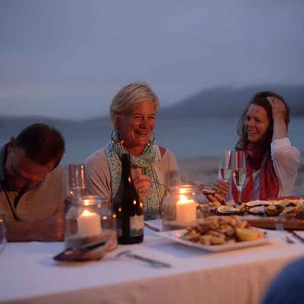 Tonight is very special; a luxury barefoot beach dinner on the secluded shores of Schouten Island. Return from Bear Hill to plump Pacific oysters and Tasmanian sparkling as part of a three-course outdoor dining experience.